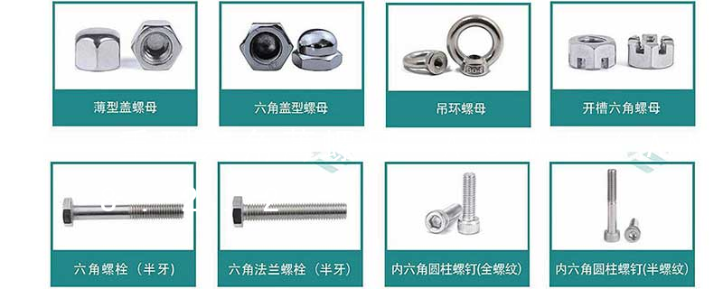 不銹鋼螺母:1. 包括六角螺母(GB6170/DIN934)、薄螺母(GB6172/DIN439)、重型螺母(公制、美制)、尼龍鎖緊螺母(DIN985-DIN982厚型)、全金屬鎖緊螺母(DIN980M)。2. 蓋型螺母(DIN1587)、法蘭面螺母(GB6177/DIN6923)、法蘭面螺母尼龍鎖緊螺母(DIN6926)、四角焊接螺母(DIN928)、六角